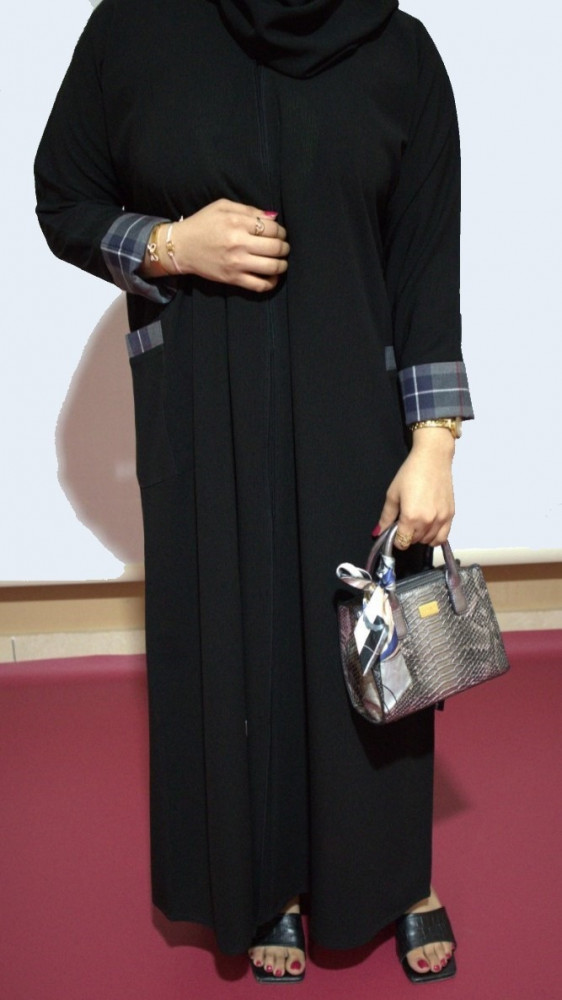 عباية راقية ذات مظهر لطيف جدا لها جيوب في الجنب مع تحديد كاروهات في الجيوب وأطراف الكم مع الطرحة وهى متوافره بمقاسات متنوعة لتناسب الجميع .